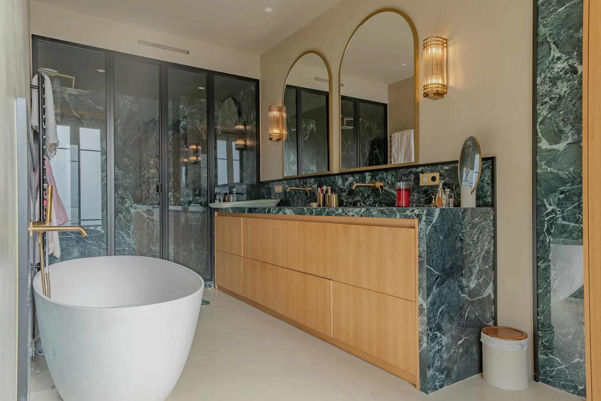 La cuisine entièrement équipée, parfaitement intégrée, dispose de prestations haut de gamme, dont une cave à vin, pensée pour un usage à la fois esthétique et fonctionnel.